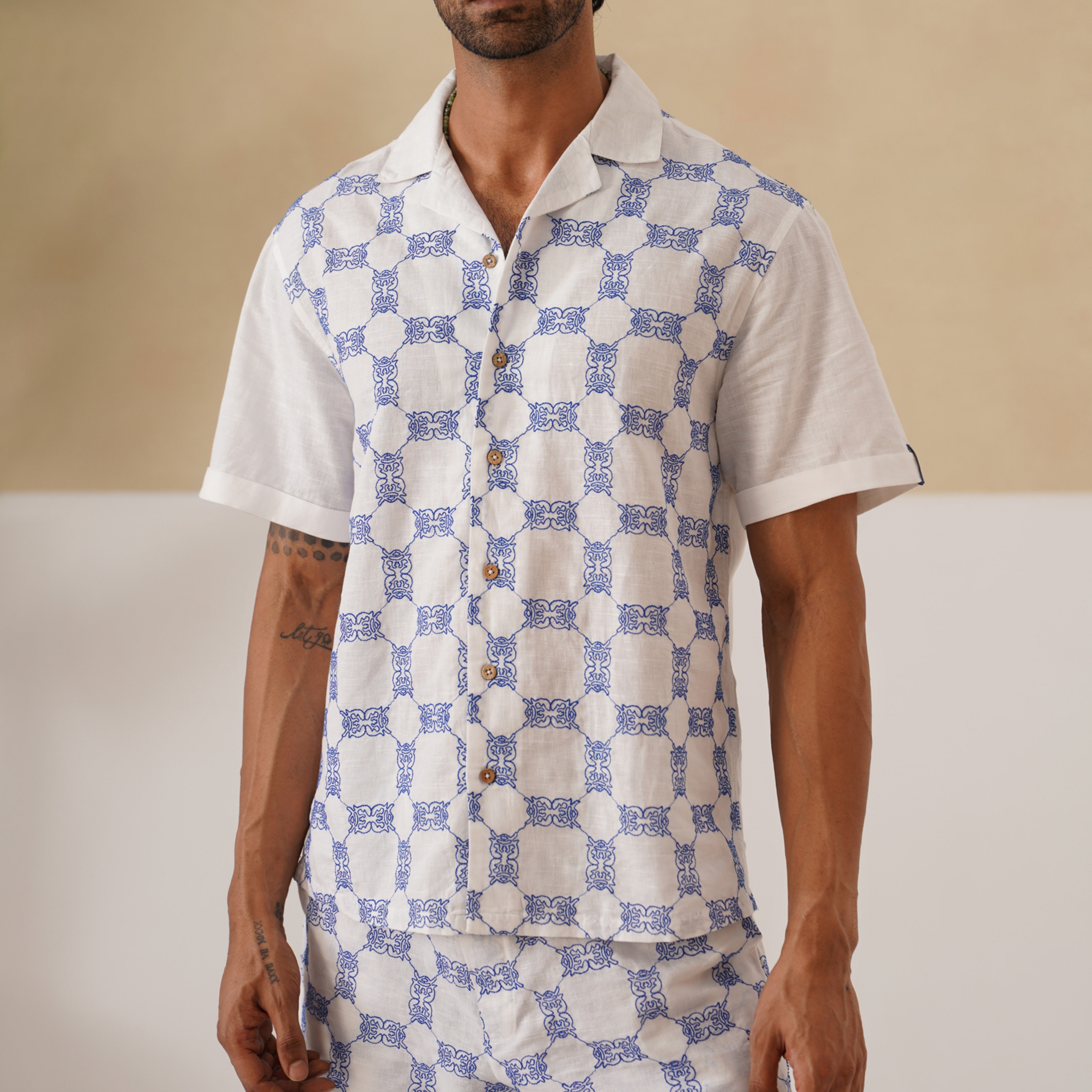 Knotty Krabs Linen camp-collar shirt in White with Polynesian Blue ‘krab lattice’ Schiffli; relaxed fit.