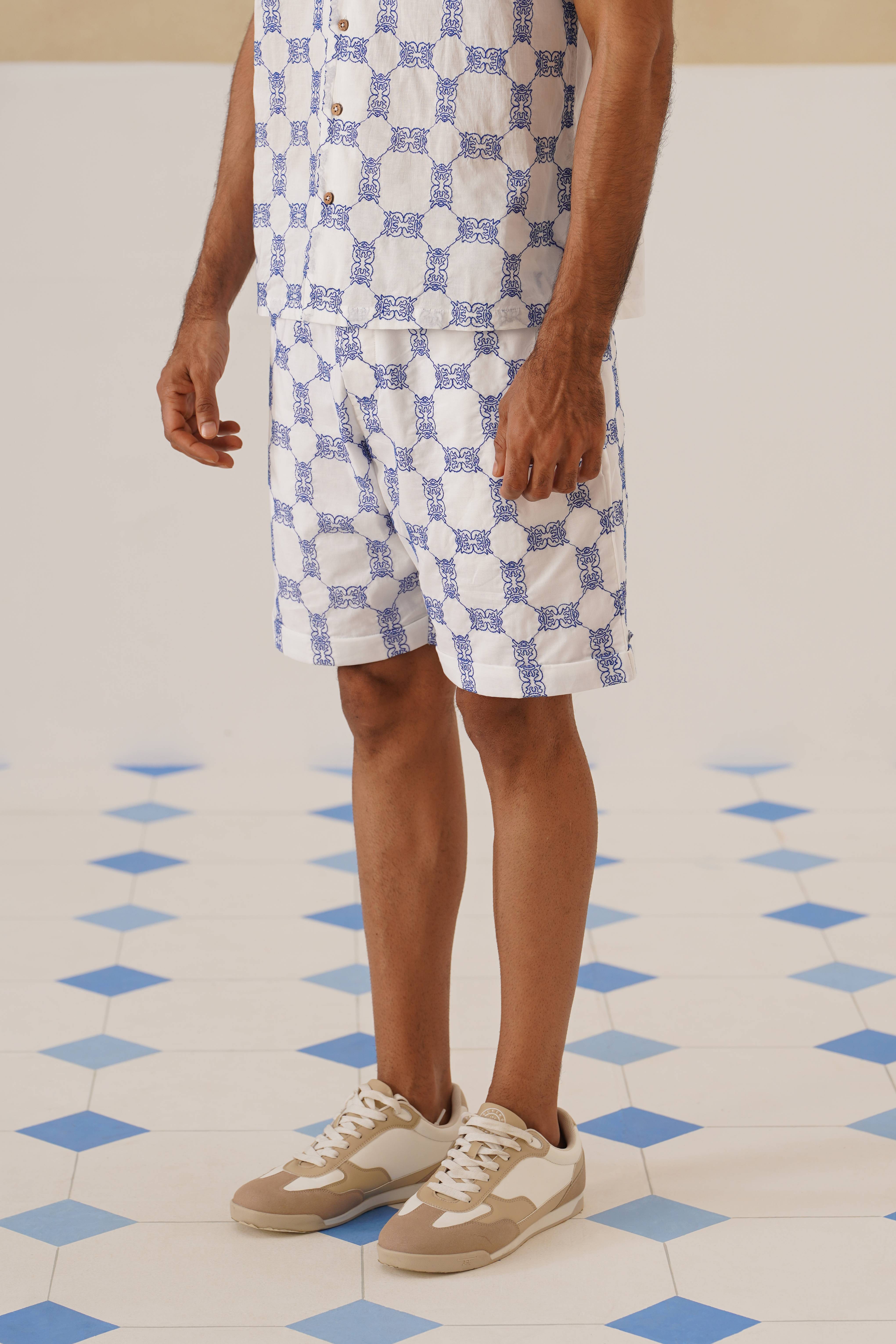 Knotty Krabs 100% Cotton shorts in White with Polynesian Blue ‘krab lattice’ Schiffli; elastic waist, pockets.