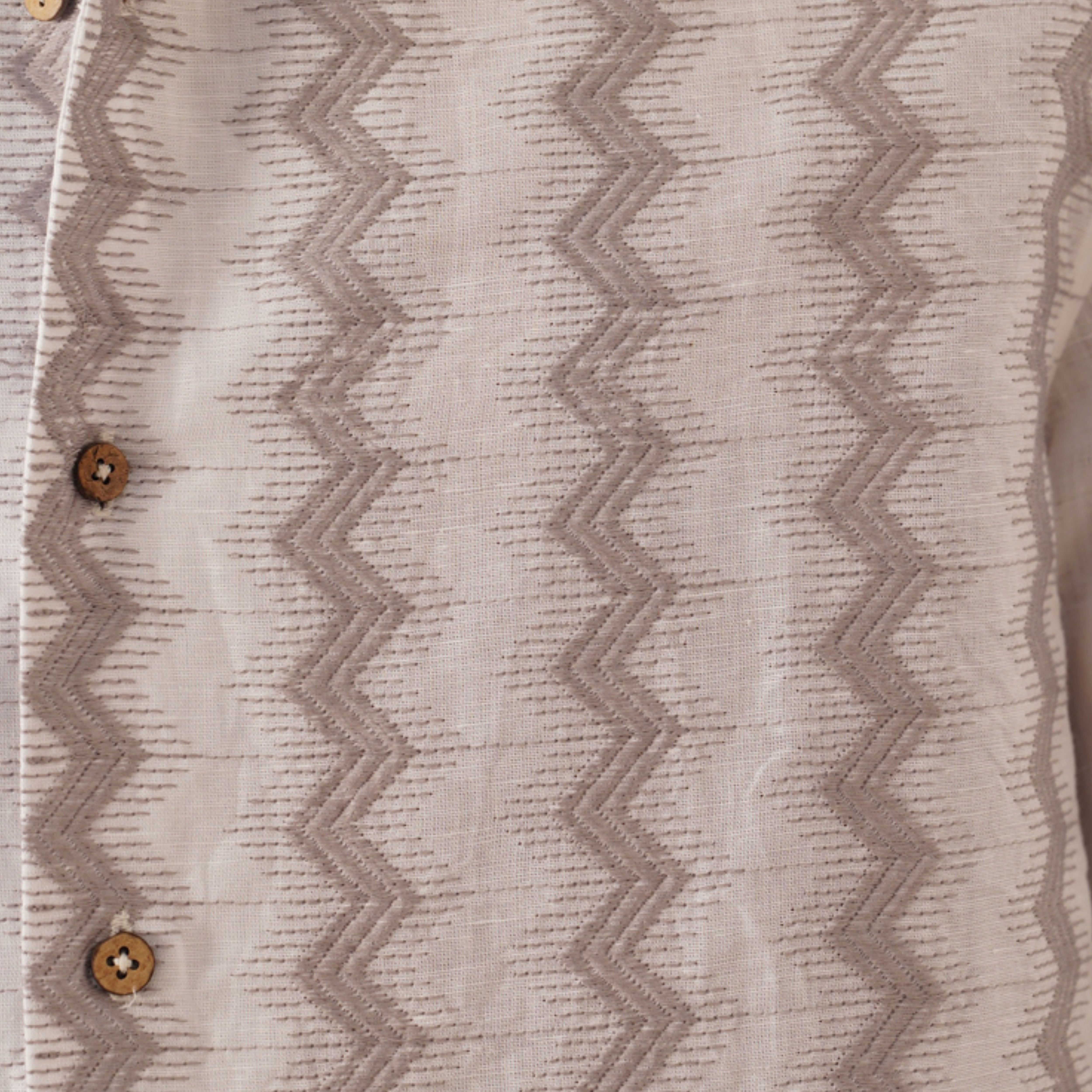 Meet Waveform — a breezy cotton-linen shirt that rides the line between minimal and standout. Its relaxed collar and airy blend of cotton and linen make it perfect for coast-to-city wear, while the zigzag Schiffli embroidery adds a subtle rhythm to the look.