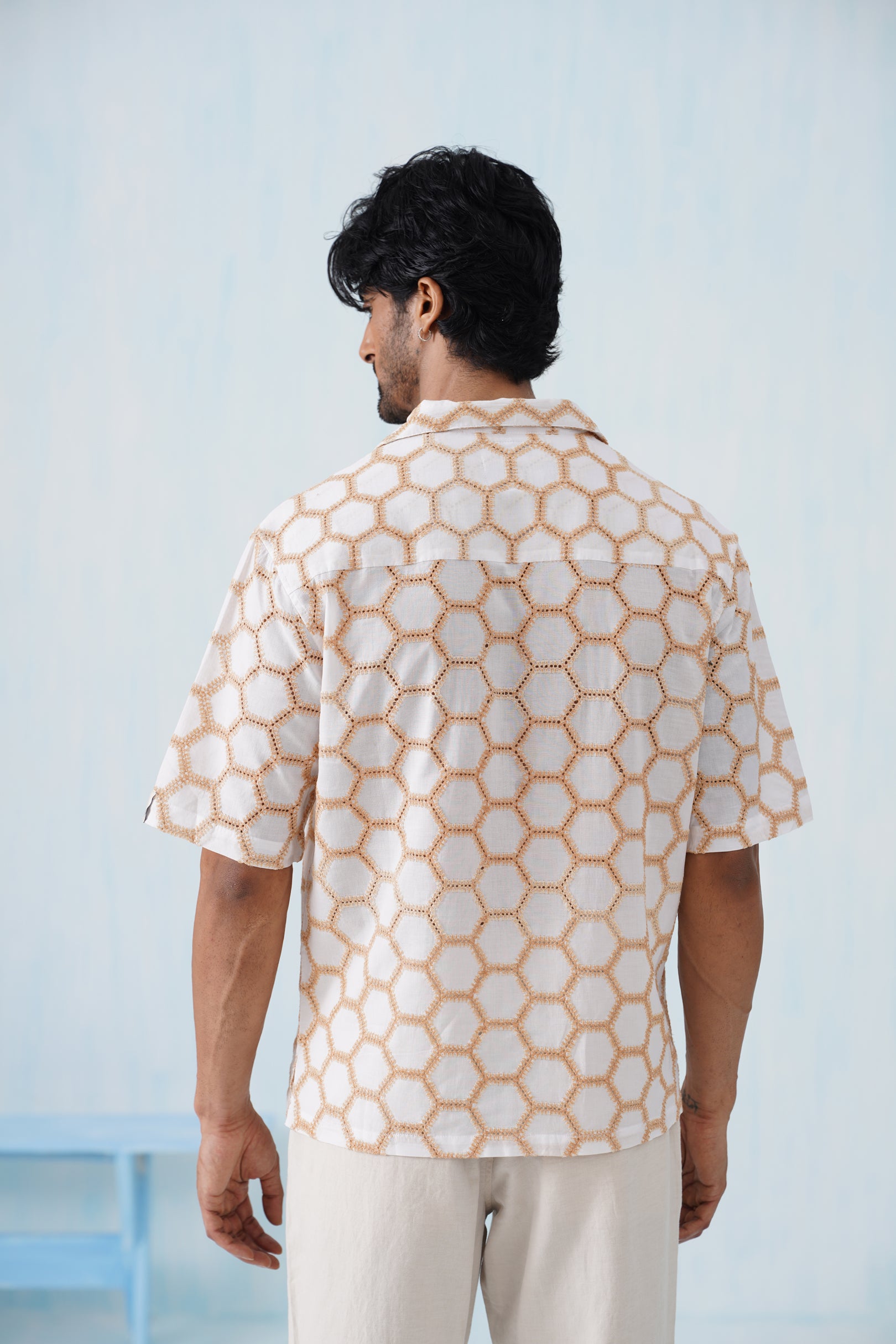 The Hive Series reimagines classic resort shirts with a touch of geometric sophistication. Crafted from 100% breathable cotton, each shirt features intricate honeycomb-inspired Schiffli embroidery, bringing subtle texture and visual interest to a timeless silhouette. The relaxed collar adds laid-back charm, while precision stitching