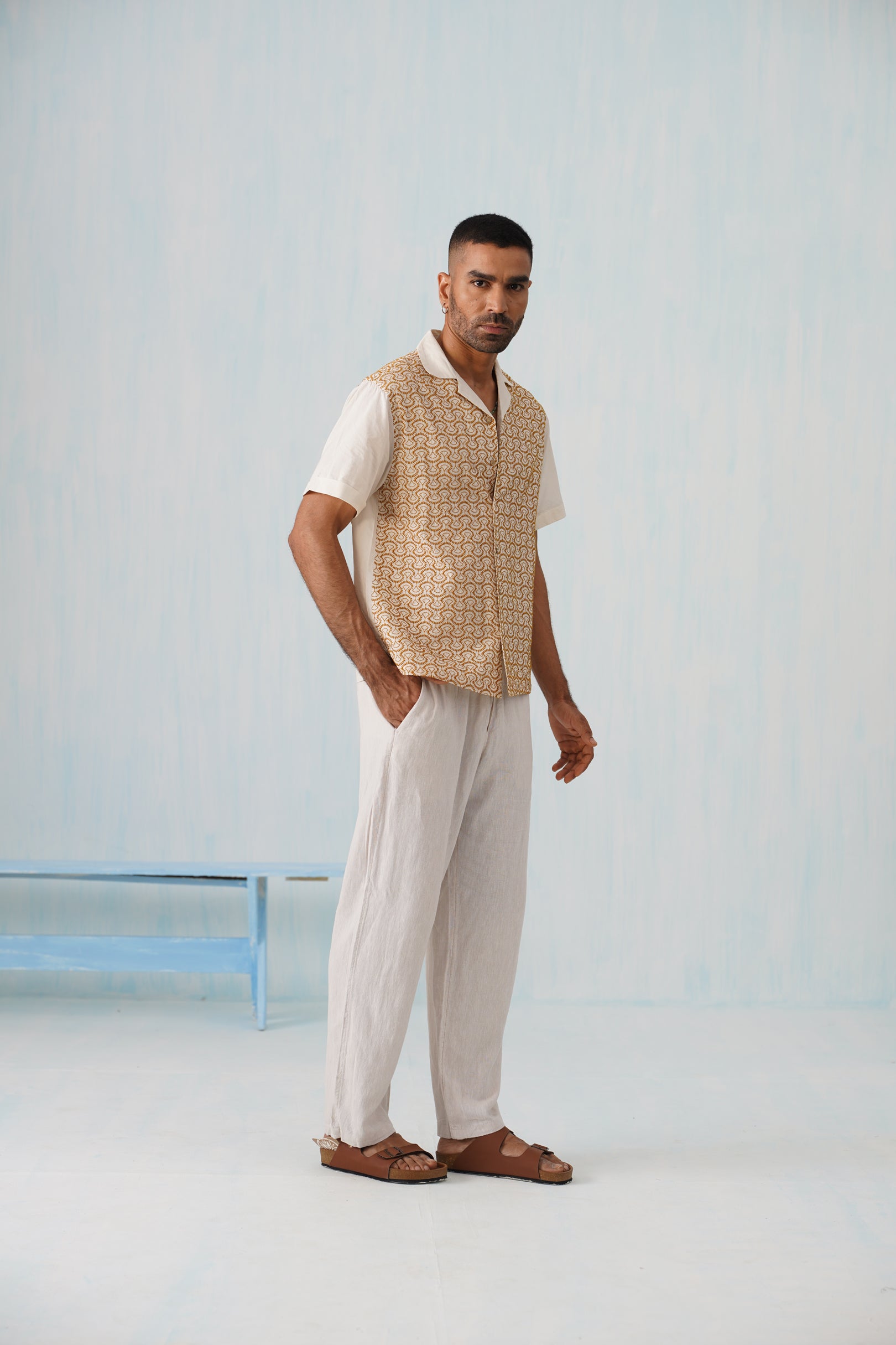 Crafted from 100% premium cotton, this shirt features a relaxed camp collar and a striking ochre geometric pattern on an ivory base, inspired by the warmth of golden coastal mornings. Lightweight, breathable, and tailored for a modern relaxed fit, it’s the ultimate resort wear essential that transitions seamlessly from beach strolls to evening socials.