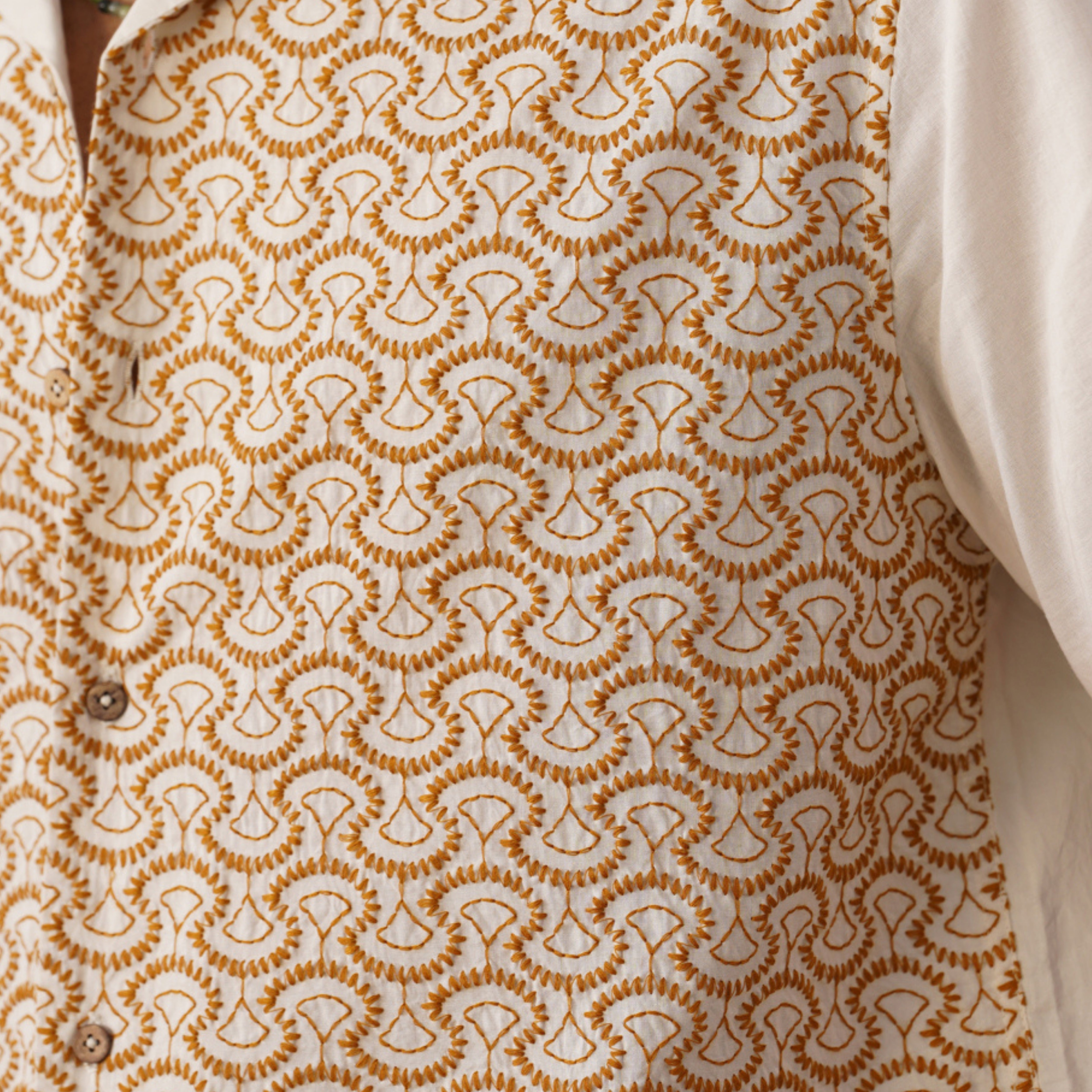 Step into the sunshine with the Sunburst Weave shirt — a perfect blend of artisanal embroidery and effortless comfort. Crafted from 100% premium cotton, this shirt features a relaxed camp collar and a striking ochre geometric pattern on an ivory base, inspired by the warmth of golden coastal mornings.