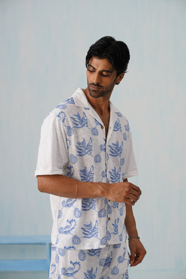 Tidal Tales brings the underwater story to your wardrobe with a relaxed-collar shirt and shorts in breathable cotton slub knit.
