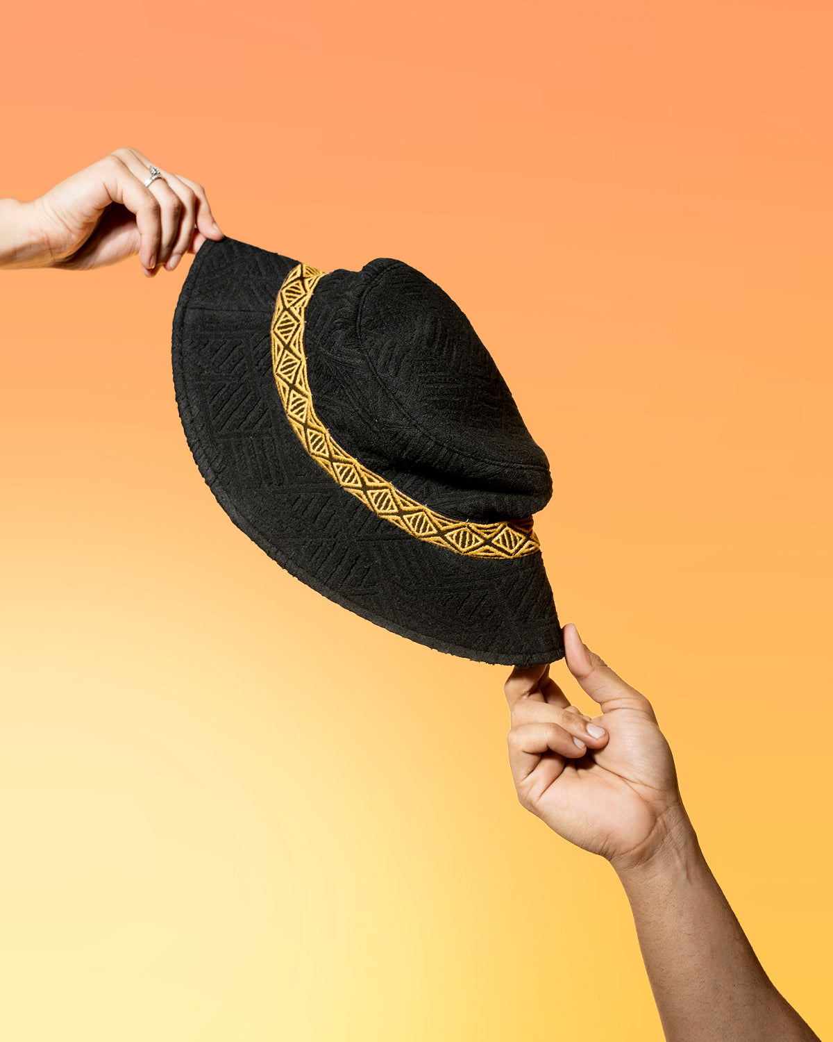 The Winter Lattice Bucket Hat is built for cozy days when you still want to look styled. Made in a textured black jersey jacquard, it features the same geometric gold lace band as the Winter Lattice Shrug, wrapping around the crown to add a sharp graphic detail to a classic silhouette. Soft yet structured, it sits comfortably on the head and works with hoodies, jackets and knits – but looks extra special when you throw it on with the Winter Lattice Shrug for a quietly coordinated winter look.